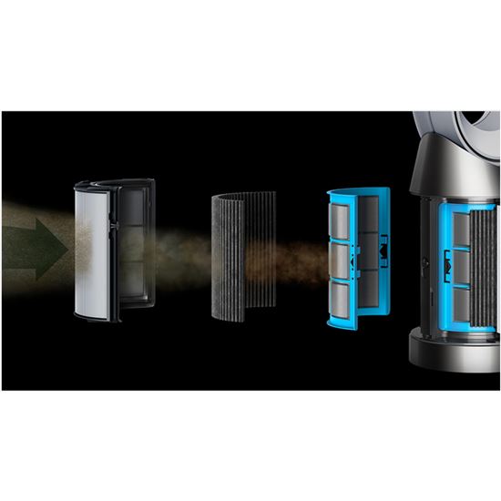 Katalytický filtr Dyson nepřetržitě zachytává a rozkládá molekuly formaldehydu1 na vodu a CO2. A není potřeba jej nikdy měnit. - Čistí vzduch v celé místnosti