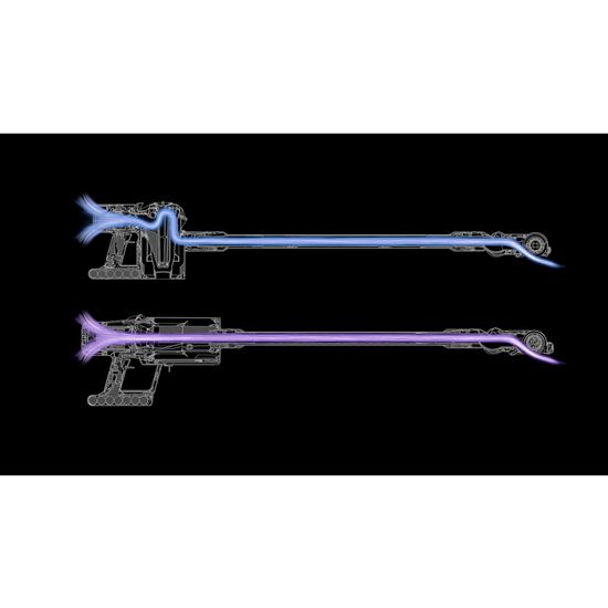 Motor, odpadní nádoba a cyklony jsou uspořádány v jedné přímce, takže vzduch je hnán do cyklon po přímé linii což vytváří o 20% větší sací výkon než u vysavače Dyson V8™.