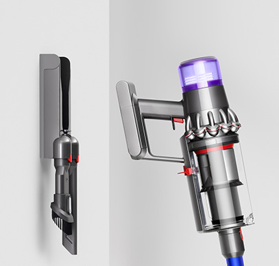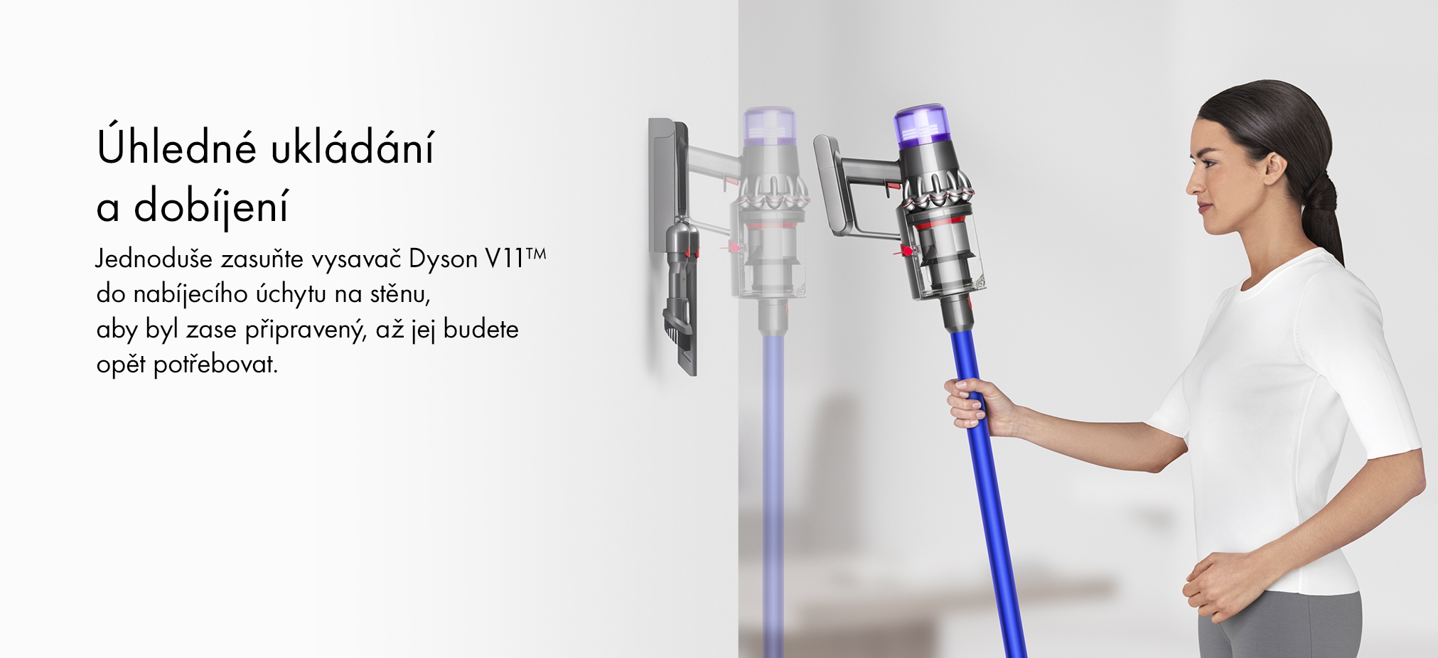 Vysavač Dyson V11 se zasouvá do úchytu na stěně, který slouží k nabíjení vysavače i úhlednému uložení příslušenství. Jedná se o praktické řešení, které je vždy po ruce. - Vyměnitelný akumulátor