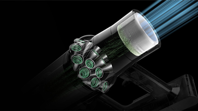 Nové uspořádání motoru, odpadní nádoby a bloku cyklon znamená, že vzduch je z podlahové hubice do cyklon dopravován mnohem efektivněji po rovné přímé dráze beze ztrát způsobených zákruty. I díky tomuto upravenému uspořádání dosahuje Dyson tak vysoký sací výkon.