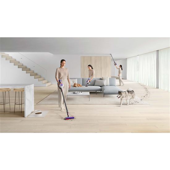 Vysavač Dyson V8 se zasouvá do úchytu na stěně, který slouží k nabíjení vysavače i úhlednému uložení příslušenství. Jedná se o praktické řešení, které je vždy po ruce. - Vysávání schodů