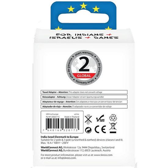 Adaptér SKROSS India-Israel-Denmark to Europe umožňuje bezpečné použití zařízení ze zemí Indie, Izrael a Dánsko v českých a evropských zásuvkách typů E a F. Připojí uzemněné i neuzemněné vidlice přívodních kabelů, bez problémů zapojíte vše od notebooků, telefonů až po fény.