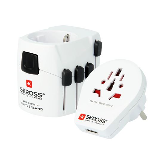 Nejvýkonnější uzemněný adaptér SKROSS PRO - World & USB umožňuje bezpečné připojení evropských zařízení ve více než 120 zemích. Díky přídavnému nástavci pro přívodní šňůry z různých regionů rozšiřuje svou použitelnost až na 205 destinací. Podporuje dvoupólové i třípólové zástrčky a díky maximální zátěži 7 A zvládne i náročnější spotřebiče, jako jsou notebooky nebo cestovní fény.