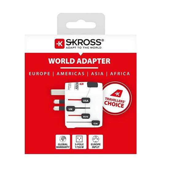 Nejvýkonnější uzemněný adaptér SKROSS PRO umožňuje bezpečné připojení evropských zařízení ve více než 120 zemích světa. Umí dvoupólové i třípólové zástrčky a díky maximální zátěži 7A zvládne i náročnější spotřebiče, jako notebooky nebo cestovní fény.