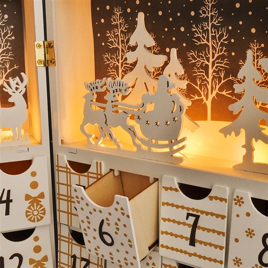 Dřevěný LED adventní kalendář je stylovou kombinací tradičního designu a moderního osvětlení. Kalendář s rozměry 40 × 30 × 4,5 cm je zdoben zimními a vánočními motivy a skrývá 24 přihrádek pro malé dárky či překvapení. Osm teple bílých LED diod decentně podsvěcuje dekoraci a vytváří příjemnou atmosféru každý prosincový večer.
