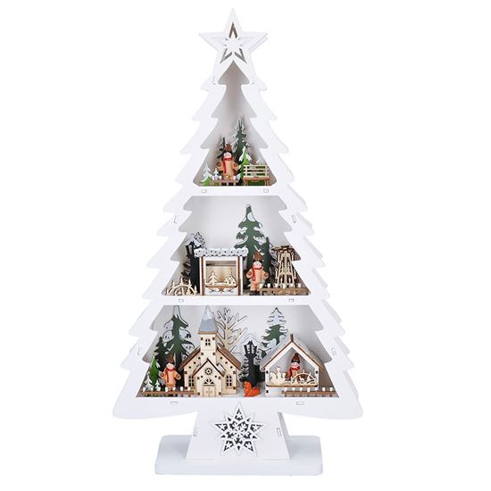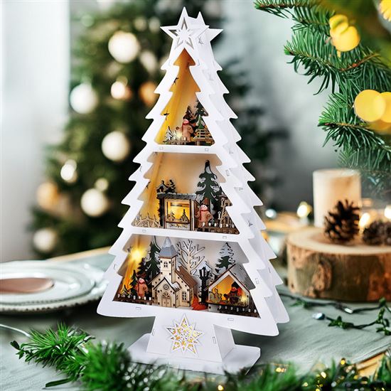 Menší varianta oblíbeného dřevěného stromku je vysoká 53 cm a šířka 30 cm. Je vybavena 13 LED diodami, které září teple bílým světlem a osvěcují drobné barevné dekorace rozmístěné po celé ploše. Barevné prvky v kombinaci s přírodním podkladem působí hravě a vesele, ideální do dětského pokoje nebo jako doplněk k tradiční výzdobě.