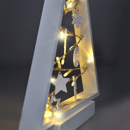 Solight LED dřevěný vánoční stromek s ozdobami, 15LED, přírodní dřevo, 37cm, 2x AA