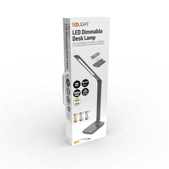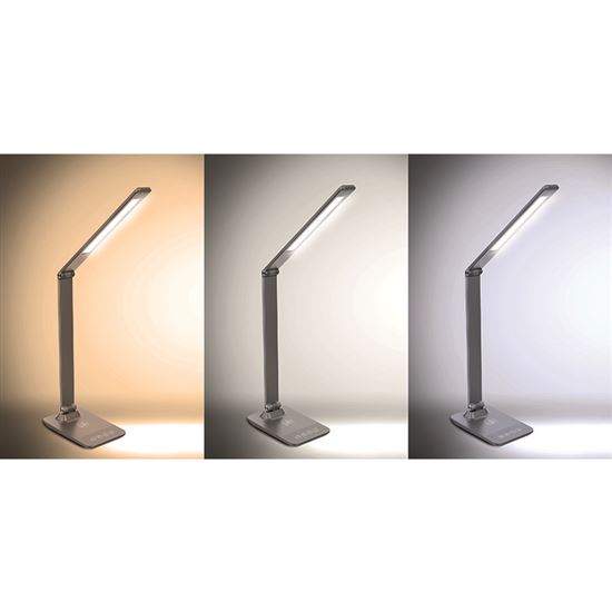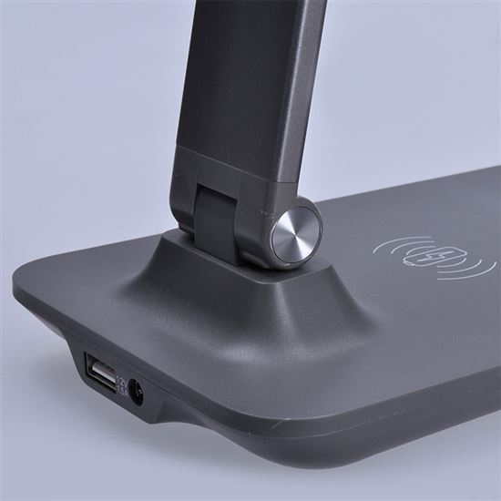Prémiová hliníková stolní LED lampička s integrovaným bezdrátovým nabíjením přináší nejen stylové, ale i vysoce funkční osvětlení. Podporuje nabíjení chytrých telefonů pomocí Qi technologie (max. 5W) a nabízí také USB port (5V/1A) pro kabelové dobíjení. Ideální pro moderní pracovní stůl.