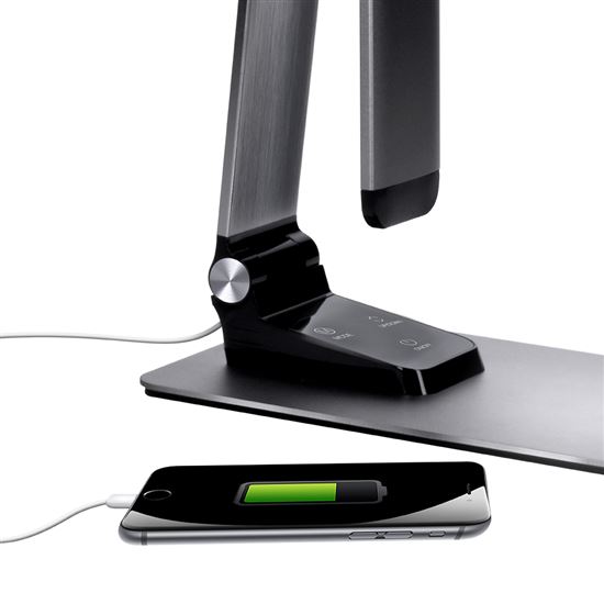 Lampička s příkonem 11 W poskytuje světelný tok až 550 lm a široký úhel svícení 120°. Nabízí také USB výstup (5V, 1000mA) pro nabíjení mobilních zařízení – kabel je součástí balení. Robustní konstrukce z hliníku se stěnou o síle 6 mm dodává lampičce stabilitu a dlouhou životnost. Rozměry: 393 x 120 x 450 mm, napájení AC 100–240V, výstup DC 12V, délka kabelu 140 cm. Barva: stříbrná. Energetická třída G.