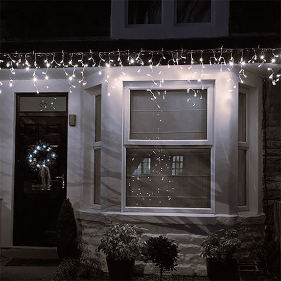 Oživte fasádu domu, balkon nebo pergolu světelným řetězem ve tvaru rampouchů s celkem 360 LED diodami v teple bílé barvě. Uspořádání světel do střídavých délek (24/56/32/48 cm) vytváří realistický efekt visícího ledu. Osvětlená část má délku 9 m, přívodní kabel měří 5 m a je zakončen transparentním vodičem, který nenarušuje vzhled dekorace.