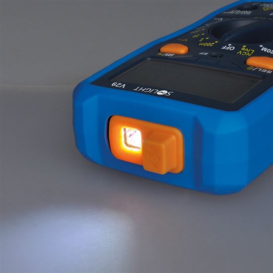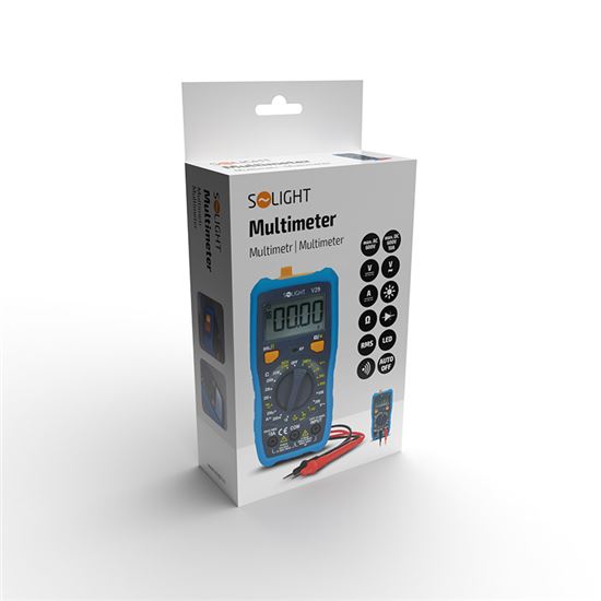 Digitální multimetr pro měření AC/DC napětí, DC proudu, odporu, a true RMS (efektivní hodnota střídavých průběhů). Nabízí tranzistorový a diodový test, test spojitosti obvodu, bezkontaktní detektor napětí (NCV), a zkoušečku vodičů pod napětím (LIVE). Funkce HOLD pro uložení naměřené hodnoty a LED svítilna pro lepší viditelnost. Ochrana proti přetížení s pojistkami 10A/600V a 500mA/600V. Napájení: 2x AAA baterie (součástí balení). Rozměry: 154x75x35 mm, hmotnost: 182g.