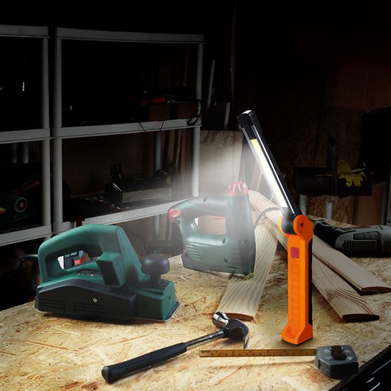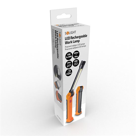 Kompaktní pracovní svítilna s hlavním COB LED zdrojem (500 lm) a přídavnými 2× SMD LED (70 lm) nabízí 3 režimy svícení: COB 100 %, COB 50 %, SMD 100 %. Vestavěný akumulátor (3,7V / 1200mAh) zajišťuje provoz až 10 hodin a plné dobití trvá cca 4 hodiny.
