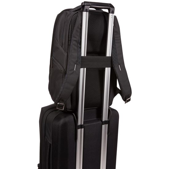 - Bezpečné zavěšení batohu na zavazadlo na kolečkách pomocí integrovaného pásu s otvorem.