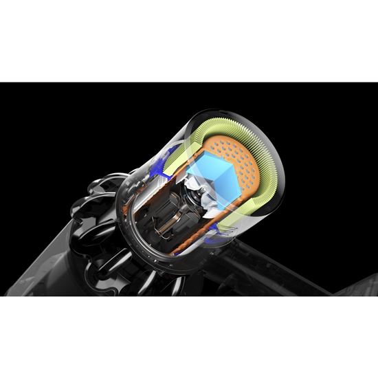 Díky vzduchotěsnému provedení bloku cyklon a tlakovému pryžovému těsnění kolem zdokonaleného filtru je celý systém naprosto vzduchotěsný – to brání úniku prachu, alergenů a bakterií zpět do okolního ovzduší. Vysavač tak zachytává 99,97% prachových částic již od velikosti pouhých 0,3 mikrometru a vypouští vzduch, který je čistější než ten, který dýcháte. Filtry před a za motorem jsou za účelem snadnější údržby integrovány do jedné společné jednotky.