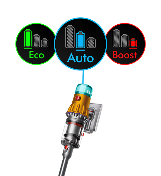 Režim Auto inteligentně přizpůsobuje sací výkon s optimálním vyvážením výkonu a doby chodu. Režim Eko poskytuje delší dobu chodu pro větší úklid, zatímco nejvyšší režim Boost je navržen pro krátký a intenzivní úklid. - Tlačítkový vypínač