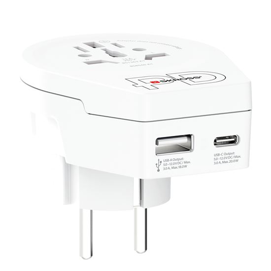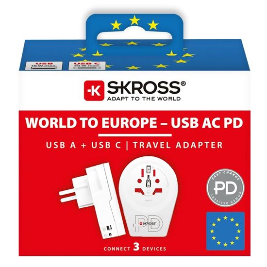 Reliable connection on the go The adapter SKROSS World to Europe USB AC20PD allows the safe use of devices from over 200 countries in European sockets of types E and F. It connects grounded and ungrounded plugs of power cables, you can easily connect everything from laptops to hair dryers.The powerful USB ports can charge up to 20 W on USB-C and 18 W on USB-A and quickly recharge phones, tablets and other electronics. And without the need to unplug the power cord from the mains socket.