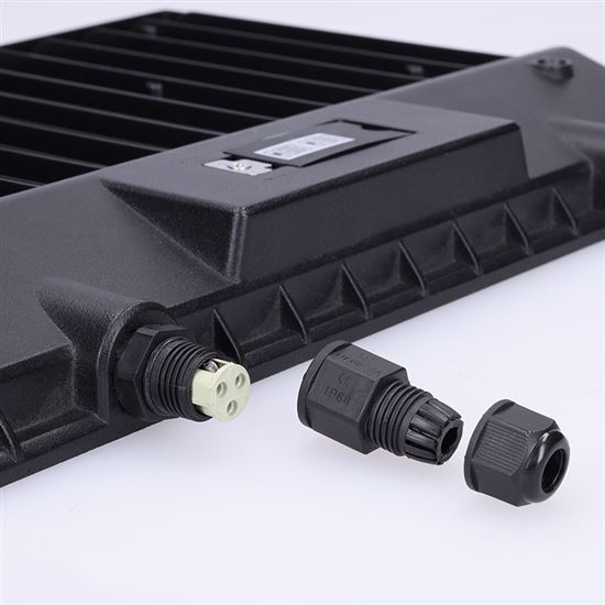 IP65 protection and a waterproof connector allow outdoor use even in harsh conditions. The spotlight is equipped with LED chips with a lifespan of 25,000 hours and provides a wide 120° light cone, ideal for evenly illuminating the area. The dimensions are 320 × 230 × 30 mm, the body is made of durable aluminum and elegant black. This spotlight is a robust, flexible and effective solution for professional use in outdoor areas.